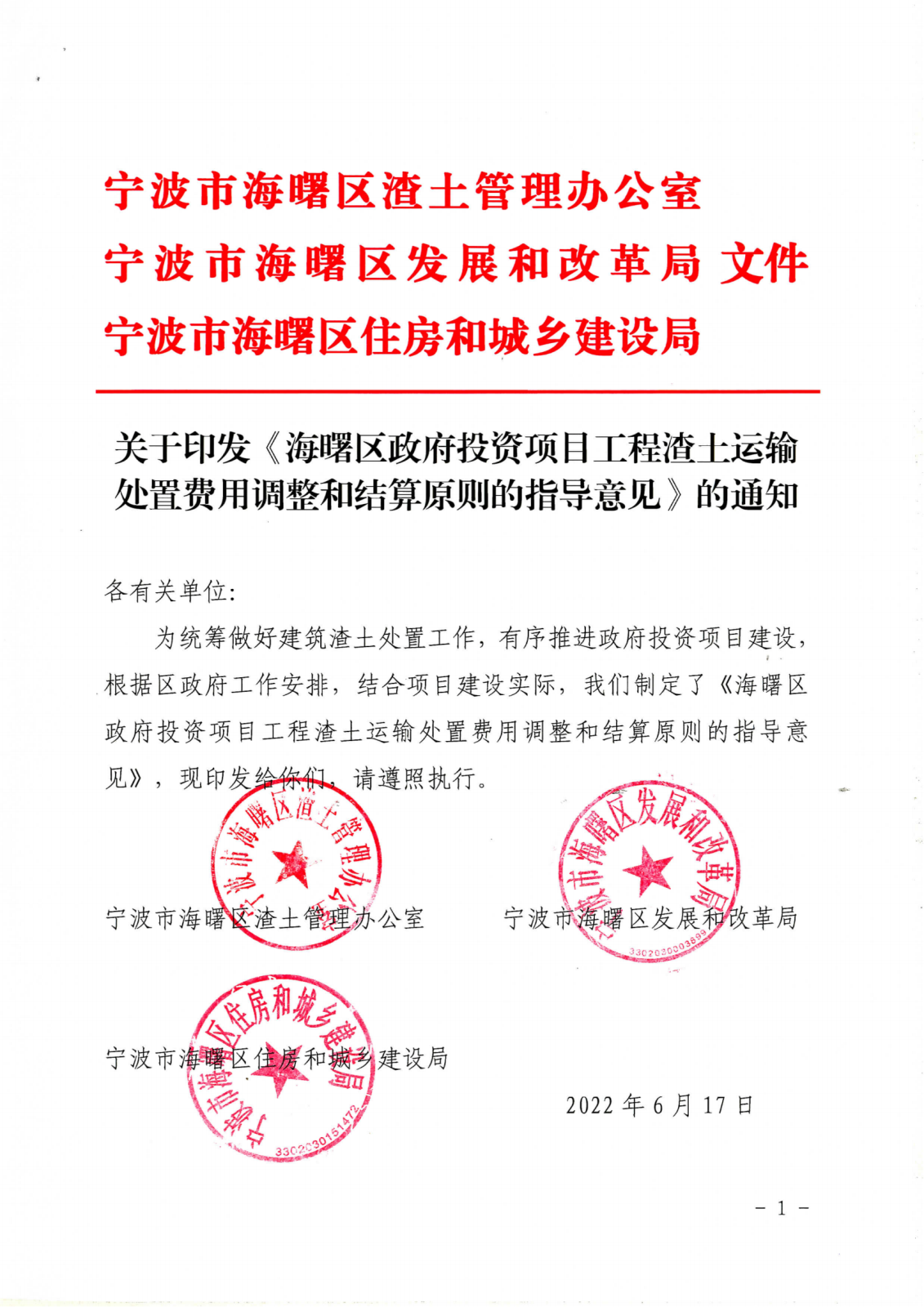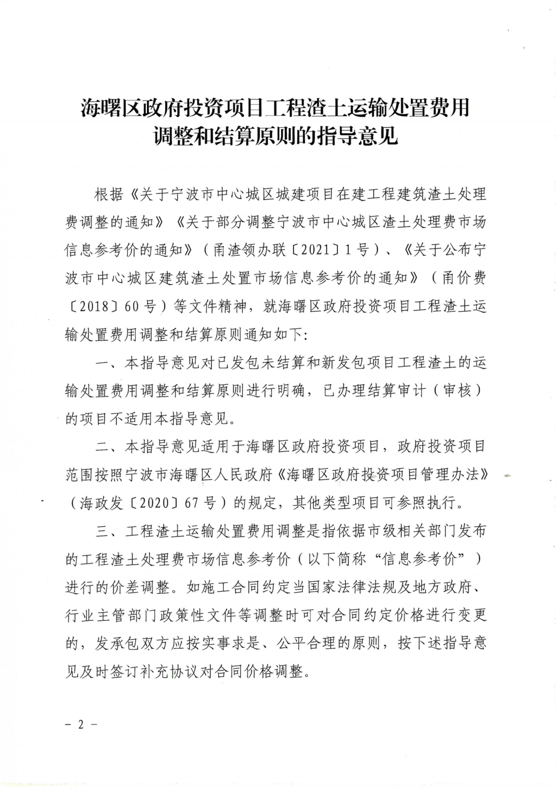 海曙区政府投资项目工程渣土运输处置费用调整和结算原则的指导意见